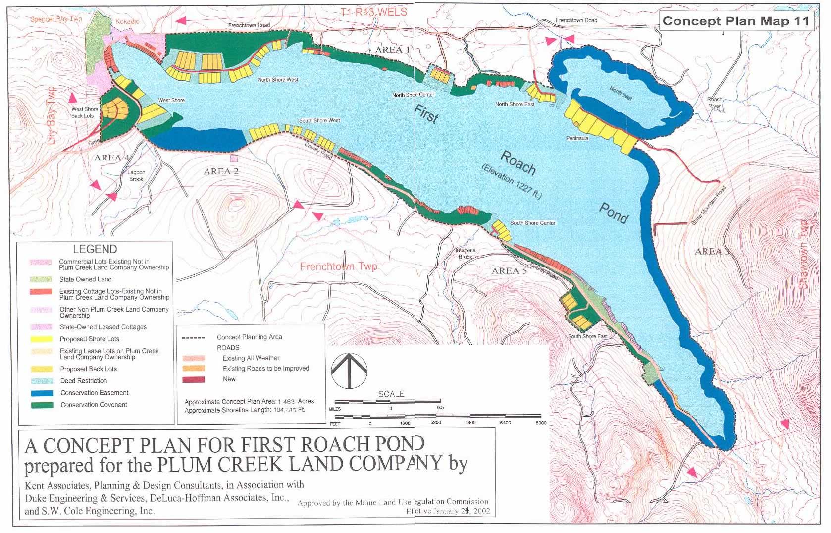 The Plan covers approximately 1,436 acres in Frenchtown Township, Piscataquis County; the majority of which is located within 500 feet of the shoreline of First Roach Pond. Expiration of the Plan will not affect subdivisions or development already reviewed and approved under the Plan, including six subdivisions and associated residential development. Permanent conservation measures implemented under the Plan will remain, including deed covenants, deed restrictions, and common open space within approved subdivisions; conservation covenants restricting development on 494 acres of surrounding timberland; and 525 acres of conservation easement on the shoreline of First Roach Pond.