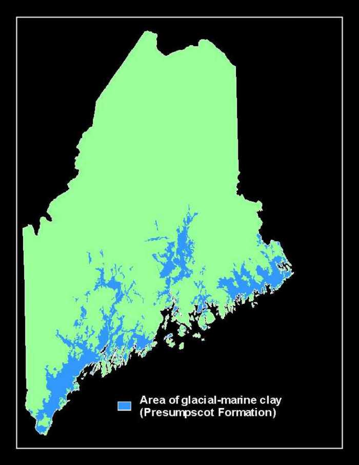 The extent of glacial-marine clay (Presumpscot Formation) is shown in blue.