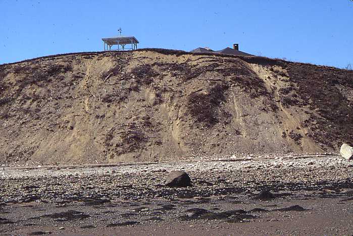 Figure 2. Highly unstable bluff with an unvegetated bluff face and a beach/gravel flat shoreline. The bluff face is too unstable to support vegetation. This bluff, a glacial esker, is eroded by waves to create a mixed sand and gravel beach in front the bluff.