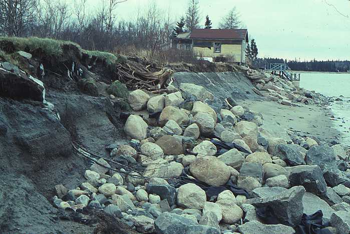 Figure 5. Highly unstable bluff with an unvegetated bluff face and an armored shoreline. This armored bluff is eroding despite an effort to shore it up with riprap, or loosely piled stone blocks. Maintenance at this site could improve bluff stability.