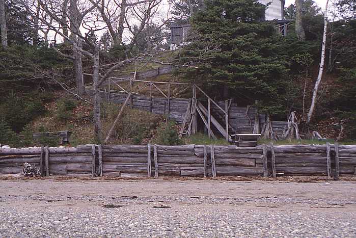 Figure 6. Stable bluff with a vegetated bluff face and an armored shoreline. The bluff face is fully vegetated and supports a mature stand of trees with vertical trunks. The presence of a wooden bulkhead suggests that erosion has occurred in the past.