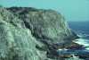 Figure 8. No bluff with a ledge shoreline. A steep slope on the bedrock surface is not a bluff. On this map, bluffs must be made of sedimentary material, generally with 3 feet or more relief. This shoreline type is very slow to change. |