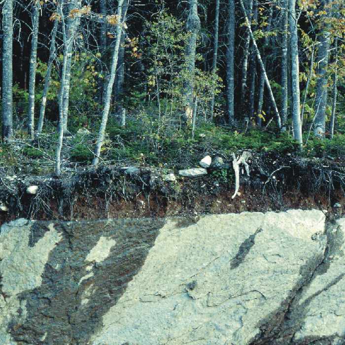 Figure 1. Till over bedrock: Road cut on Route 17 in Township D, showing thin layer of till overlying glacially eroded bedrock. Dark streaks on the rock face are wet areas.