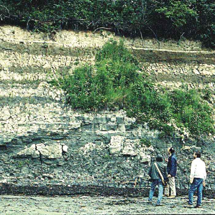 Figure 4. Clay-silt: Coastal bluff in Brunswick, exposing a thick section of well-stratified glaciomarine seafloor mud (Presumpscot Formation).