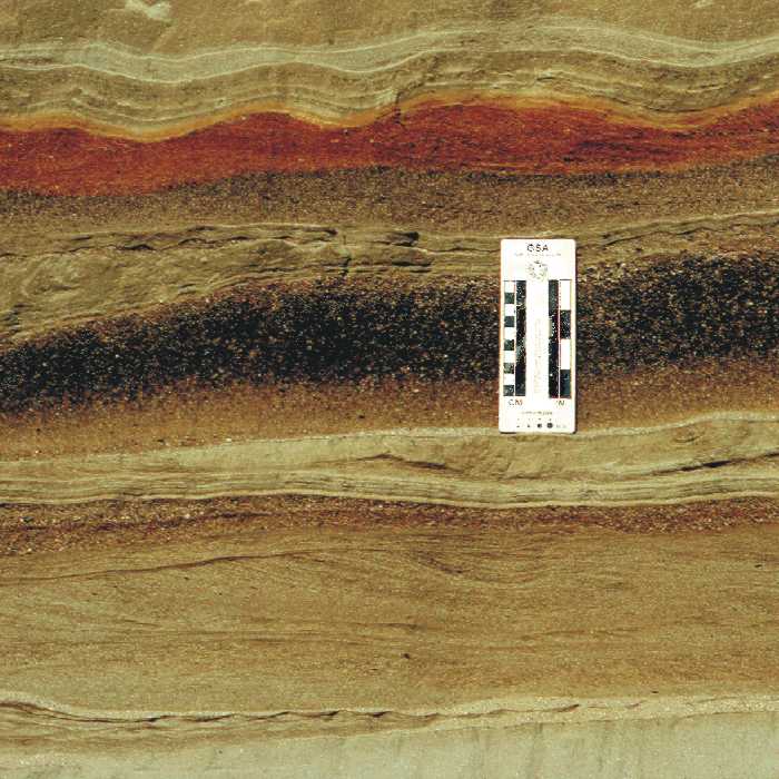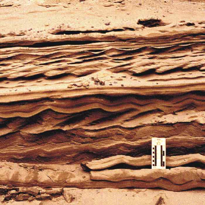 Figure 5. Sand: Close-up of pit face in glaciomarine delta west of Dolby Pond, Millinocket, showing current ripples in sandy delta foreset beds. Scale card is graduated in centimeters and inches.