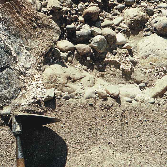 Figure 8. Pebble to boulder gravel (fossiliferous) over gravelly sand: Close-up of pit face in marine nearshore deposit with fossil shells and barnacle-encrusted stones.