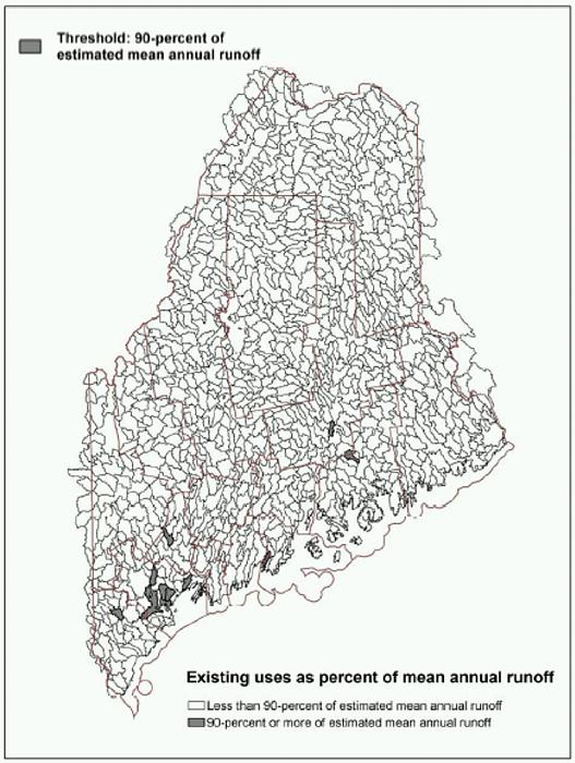 Figure 2. Existing uses as percent of mean annual runoff. Watersheds with ratio of 90-percent or more shown in gray. (299 kb PDF version)