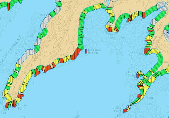 The coastal landslide hazards map and the coastal bluffs maps are companions. They each show a different aspect of the shoreline. The coastal bluffs map describes what happens on the face of a bluff and indicates how stable the bluff is with a simple color pattern of red, yellow, and green. The coastal bluffs map also shows what the shoreline at the high tide line is composed of (rock, armor, marsh, or beach). Each of these shoreline types also can be used to understand the nature of the bluff above the high-tide line.