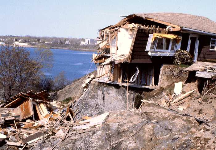 Figure 7. A clay bluff on the north shore of Rockland Harbor failed in 1996. This landslide formed a new scarp about 200 feet landward of the original top of the bluff in just a few hours. Two homes were destroyed as a result of this catastrophic slide.