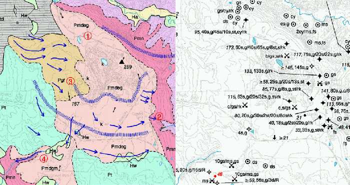 Figure 3. Portion of a surficial geology map (left) and a surficial materials map (right). Note how the data observations on the materials map are clustered around the eastern border of the Pmdeg unit. As a result, the Pmdeg-Pmn boundary is the most accurately located boundary on this part of the map. Other boundaries were interpreted from topography and air photos.