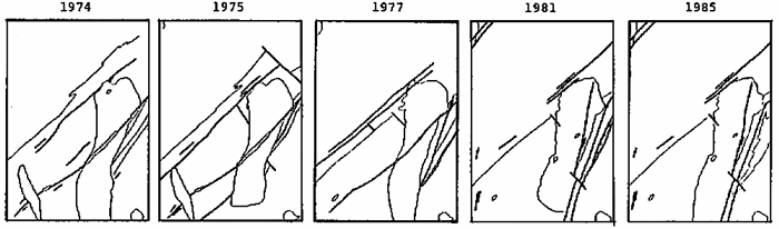 Figure 7. These diagrams show how the interpretation of the geology in the Big Lake quadrangle changed over a span of 10 years. Continuing data collection and field work in the area refined the interpretation of the contacts, causing the portrayal of the shape of the rock boundaries to change over time.