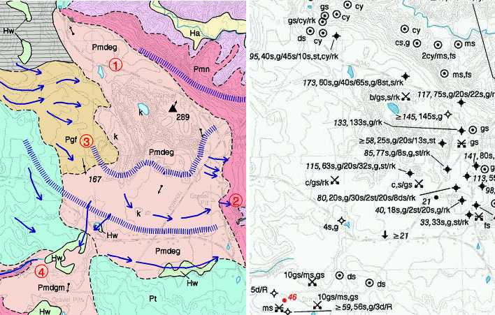 Figure 2. Portion of a surficial geology map (left) and a surficial materials map (right). Note how the data observations on the materials map are clustered around the eastern border of the Pmdeg unit. As a result, the Pmdeg-Pmn boundary is the most accurately located boundary on this part of the map. Other boundaries were interpreted from topography and air photos.