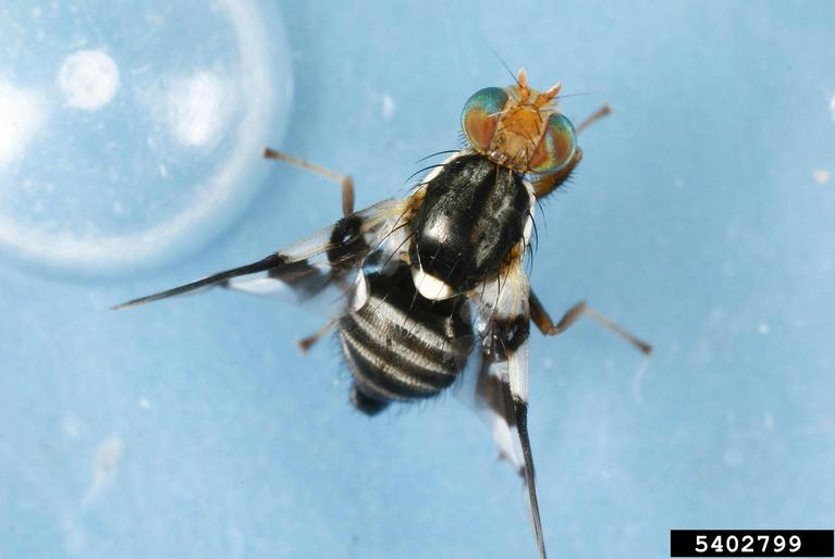 The apple maggot fly is about l/4-3/8 inches long. It has a black abdomen. Females have four white bands on the abdomen. The smaller males have three bands. The wings are clear but are marked with black bands.