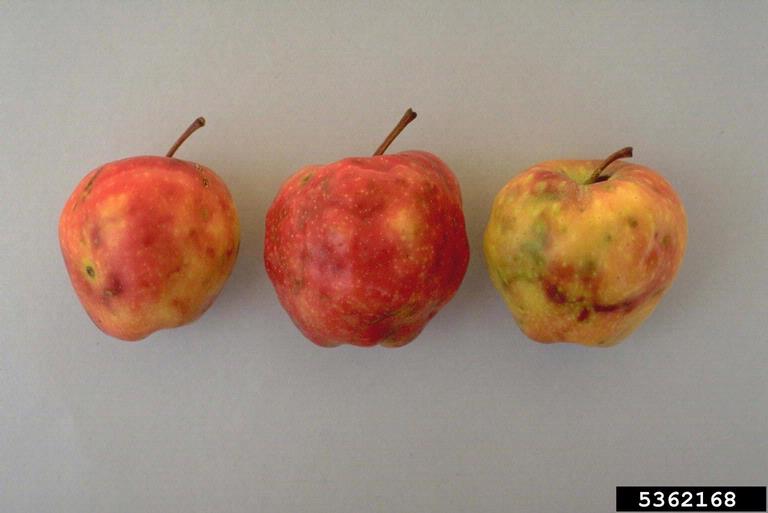 Apple maggots cause two types of injury: "dimpling," and tunneling. Dimpling occurs around the site where eggs are laid, causing the flesh to stop growing, resulting in a sunken, misshapen, dimpled area. Tunneling, done by the larvae (maggots) eating in the fruit, causes the pulp to break down, discolor, and start to rot. The tunnels are often enlarged by bacterial decay. Damaged fruit eventually becomes soft and rotten and cannot be used.