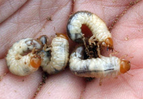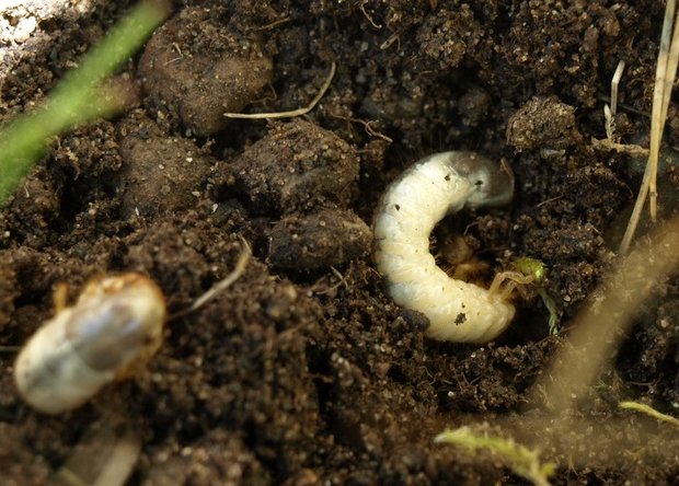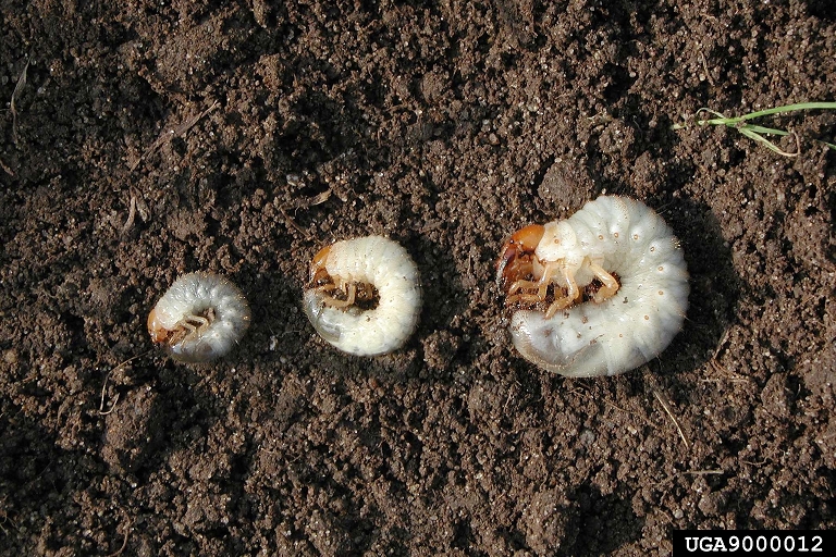 White grubs is a general name for the larval stage of beetles in the family Scarabaeidae, order Coleoptera, that feed on the roots of turf. All species of scarab beetles have larvae that are C-shaped and vary in size depending on the species and larval age (instar). Heavy white grub infestations can destroy grass roots, causing the affected area to become spongy, which allows the sod to be rolled back like a piece of carpet. Light infestations do little damage, especially if lawns are healthy. Species of concern in Maine include Japanese beetle (Popillia japonica), European chafer (Rhizotrogus majalis), May or June beetle, also called Junebug (Phyllophaga spp.), Oriental beetle (Exomala orientalis), rose chafer (Macrodactylus subspinosus) and Asiatic garden beetle (Maladera castanea).