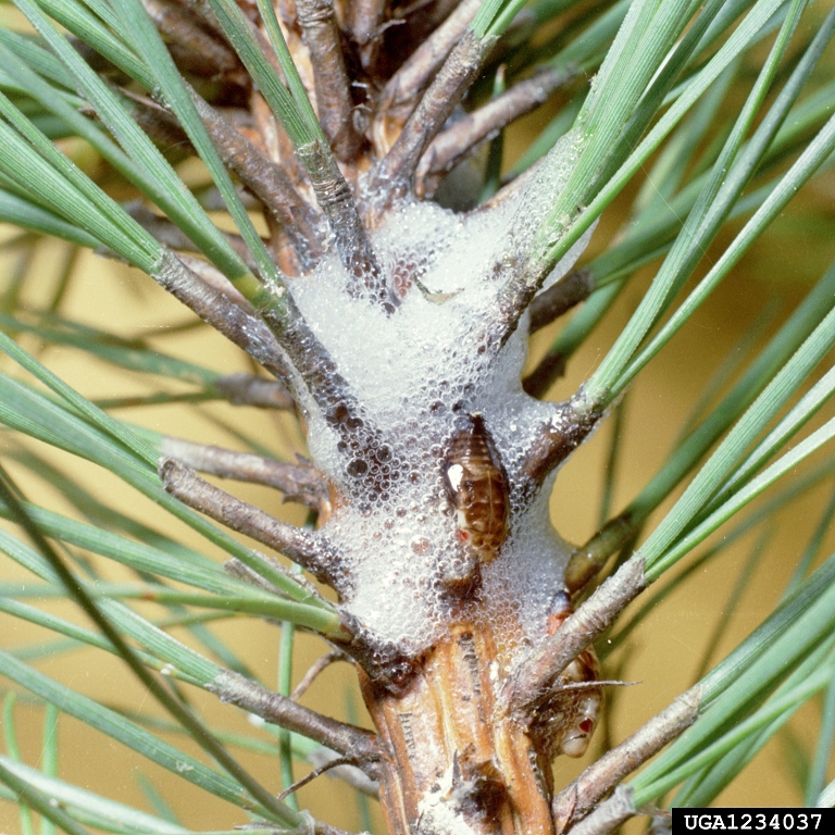 There are many species of spittlebugs that feed on conifers and broad-leaved ornamentals. Most are unsightly but do little damage to the plants. Two species, the pine spittlebug and the Saratoga spittlebug, are considered serious pests in Maine. Heavy infestations cause flagging branches, dead terminal growth, and stunted and distorted stems and branches, and will kill trees in two to three years.