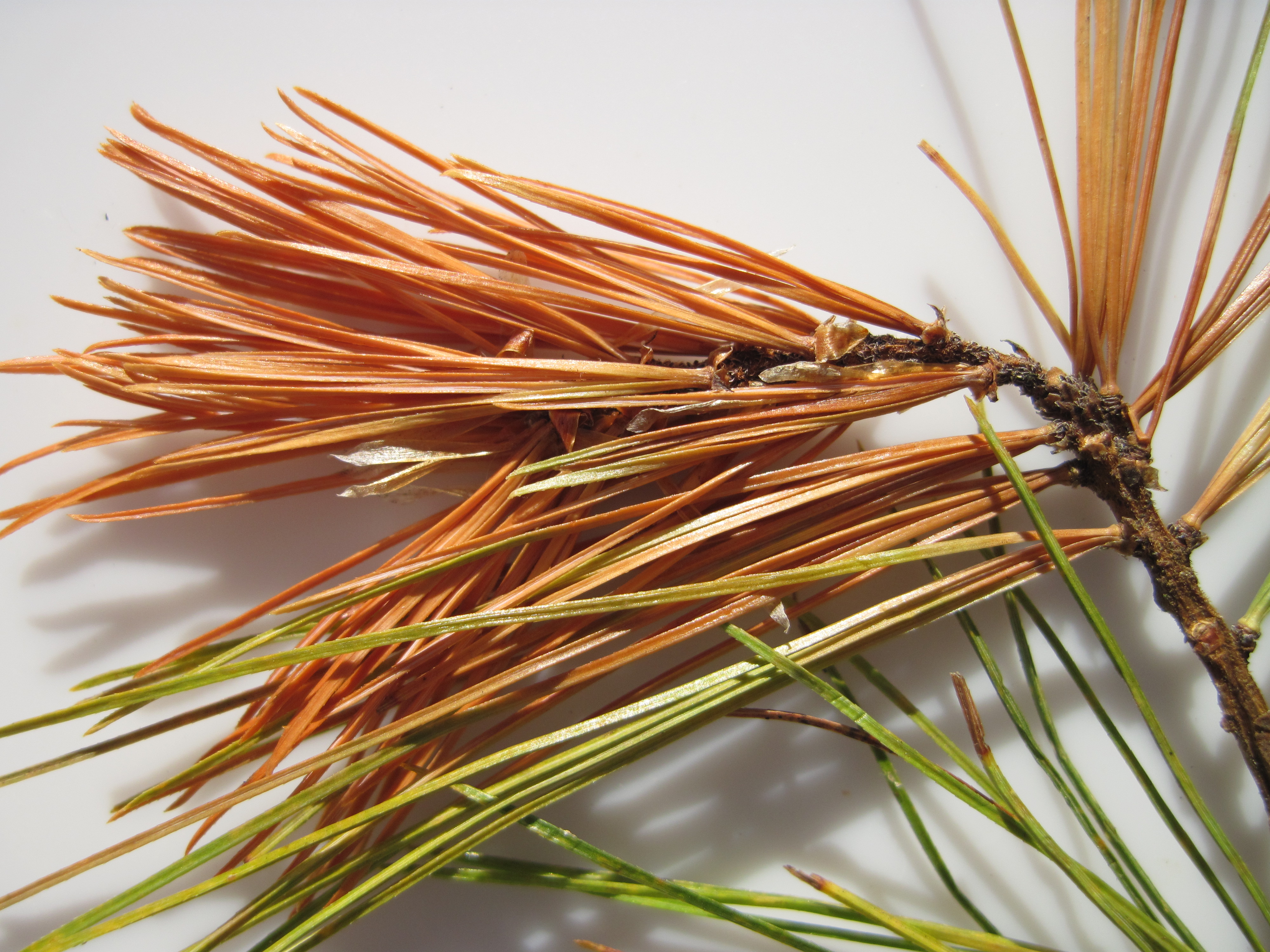 The pine leaf adelgid, sometimes called the pine leaf chermid or the pine leaf aphid, is a native insect that occurs on both white pine and spruce. It is regarded as a very important pest of white pine, where it grows adjacent to red and black spruce. It causes galls on the new shoots of red and black spruce and migrates from these to the shoots of white pine. The galls on spruce are unsightly, but cause little injury to the tree. However, severe infestations of nymphs on white pine will kill the current year's shoots in late summer, and moderate infestations may cause the shoots to die the next spring.