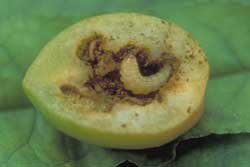 Larvae develop inside fruit. Fully grown larvae (grub) is about 3/8 long, C-shaped, yellowish-white, legless, with a brown head.