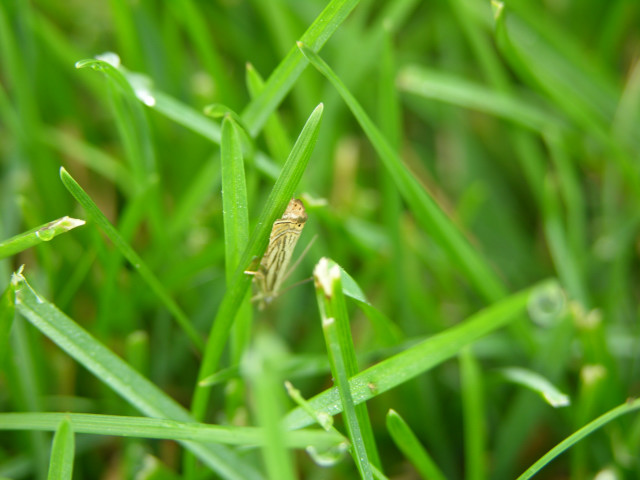 Several species of caterpillars are called sod webworms and in the larval stage they can be highly destructive pests of lawns. The caterpillars live in silk-lined tunnels constructed in the thatch near the soil surface. They chew grass blades off just above the thatch line, and are mainly active at night. The adults of sod webworms are often called lawn moths because they fly in a jerky zigzag pattern a few feet above the lawn.