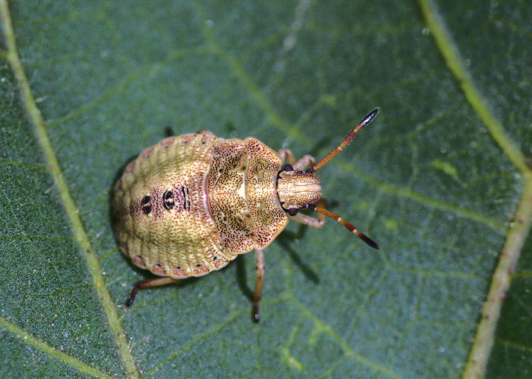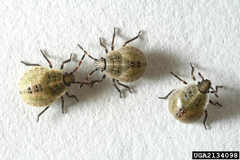 Stink bugs have five nymphal stages, or instars. The nymphs are smaller than adults, but similar in shape. Nymphs of the brown stink bug are light green.