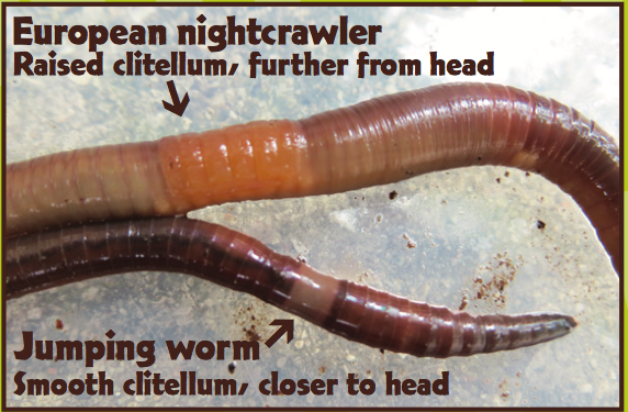 [Jumping Worm Photos, left to right: Amynthas Worm and Nightcrawler, Photo courtesy Wisconsin DNR, Amynthas Worm clitellum, Photo courtesy University of Illinois]