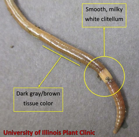 - Immature worms (seen April – late June) do not have the clitellum but can be identified by the setae (bristles) that encircle their bodies. (see illustration below
