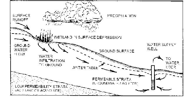 Freshwater wetlands receive their water mainly from surface water runoff, groundwater discharge and direct precipitation. Surface water runoff collects in isolated depressions surrounded by high ground, or overflows from rivers and lakes following snowmelt or periods of heavy rainfall. In other areas where the groundwater is close to the surface, water may pond on the surface when there is a period of sustained rainfall. Groundwater also discharges periodically to spring or seepage areas when groundwater recharge exceeds subsurface capacity.
