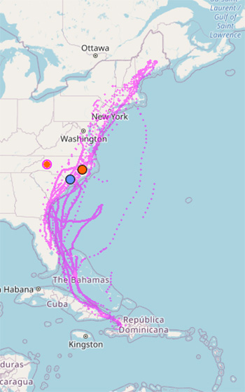 - Click the box next to any of the bird’s names and it will show the points on the map. If you click on the name of the bird, it will highlight it and show the bird’s track on the map. You should then be able to zoom in close and see where it has been.