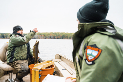 Winter and open water angler surveys provide excellent opportunities to collect length and weight data, scales for aging, and stomach contents to assess prey availability. They are also our best source of data related to angler success. But to assess the overall health of fish populations, biologists also directly sample fish throughout the open-water season using nets, traps, and other sampling gear. These methods are often more efficient and require less effort than angler surveys; and because sampling equipment is standardized and not limited to legal-sized fish, direct sampling provides better, less biased information on fish health and population structure.