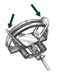 - Open the trap. If possible, position the trap flat on the ground. To open the trap, push down using your hands or feet on the levers located at either end of the jaws (see arrows in the image). This will release tension on the jaws and allow you to remove the dog’s foot.