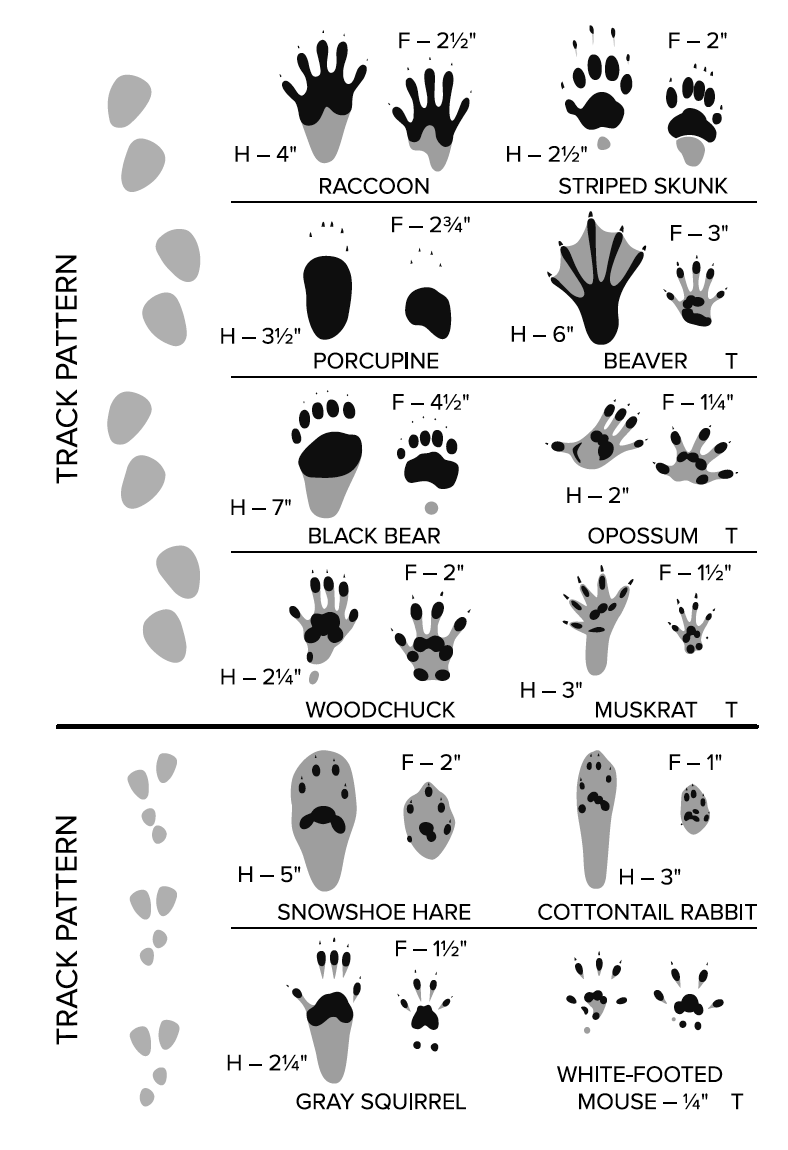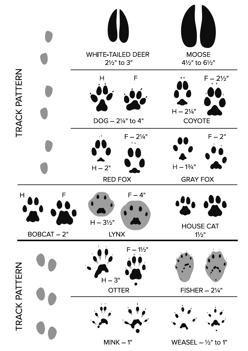 Sizes indicate length of tracks. Depending on the substrate (snow, mud, dust, sand, etc.) and the speed the animal was moving, tracks may show great variability in their appearance.