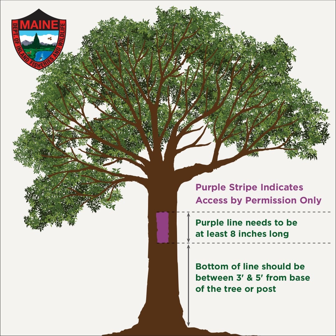 You may also mark your property with purple paint to indicate "Access by Permission Only." Paint a vertical stripe at least one inch wide and eight inches long on trees, posts, or stones, between three and five feet off the ground. Stripes or signs must be placed no more than 100 feet apart and at all vehicular access points from a public road.