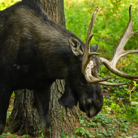 A moose can eat up to 35 lbs of food a day and store over 100 pounds in its stomach. It eats a variety of so-called ‘browse’; leaves, buds and twigs of woody shrubs and trees; as well as tasty underwater aquatic plants in the summer. It can run 35 mph and can easily swim 10 miles. The moose is the state mammal of Maine. Learn more about moose from Maine Department of Inland Fisheries and Wildlife.
